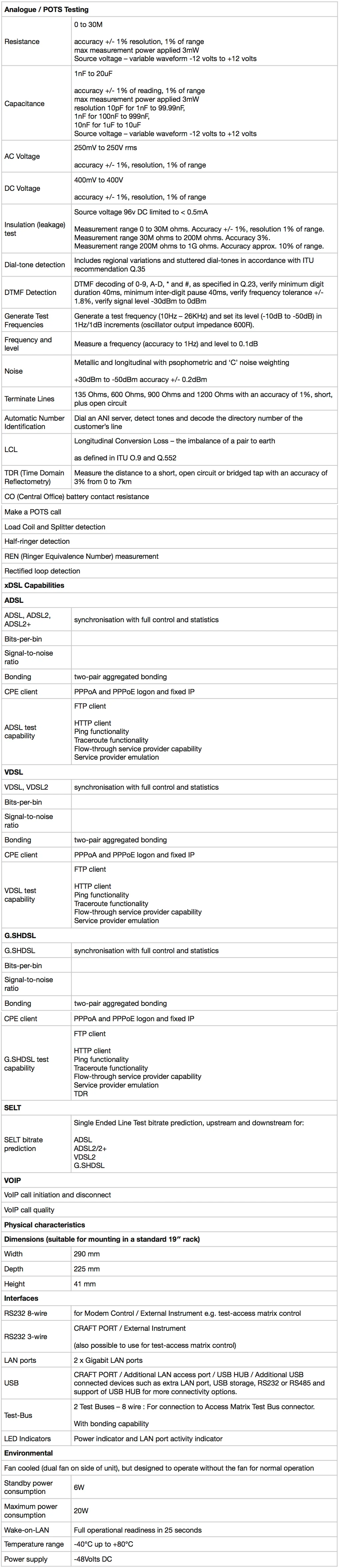 Tests are fast: a full both-way POTS test completes within 30 seconds including all analogue measurements, dial-tone detection and break dial-tone.